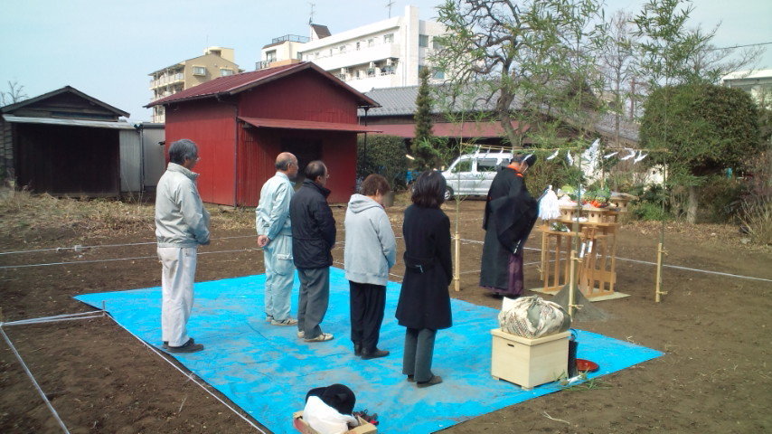 先週地縄張りといって、建物の大まかな位置を出しテープを張りました。